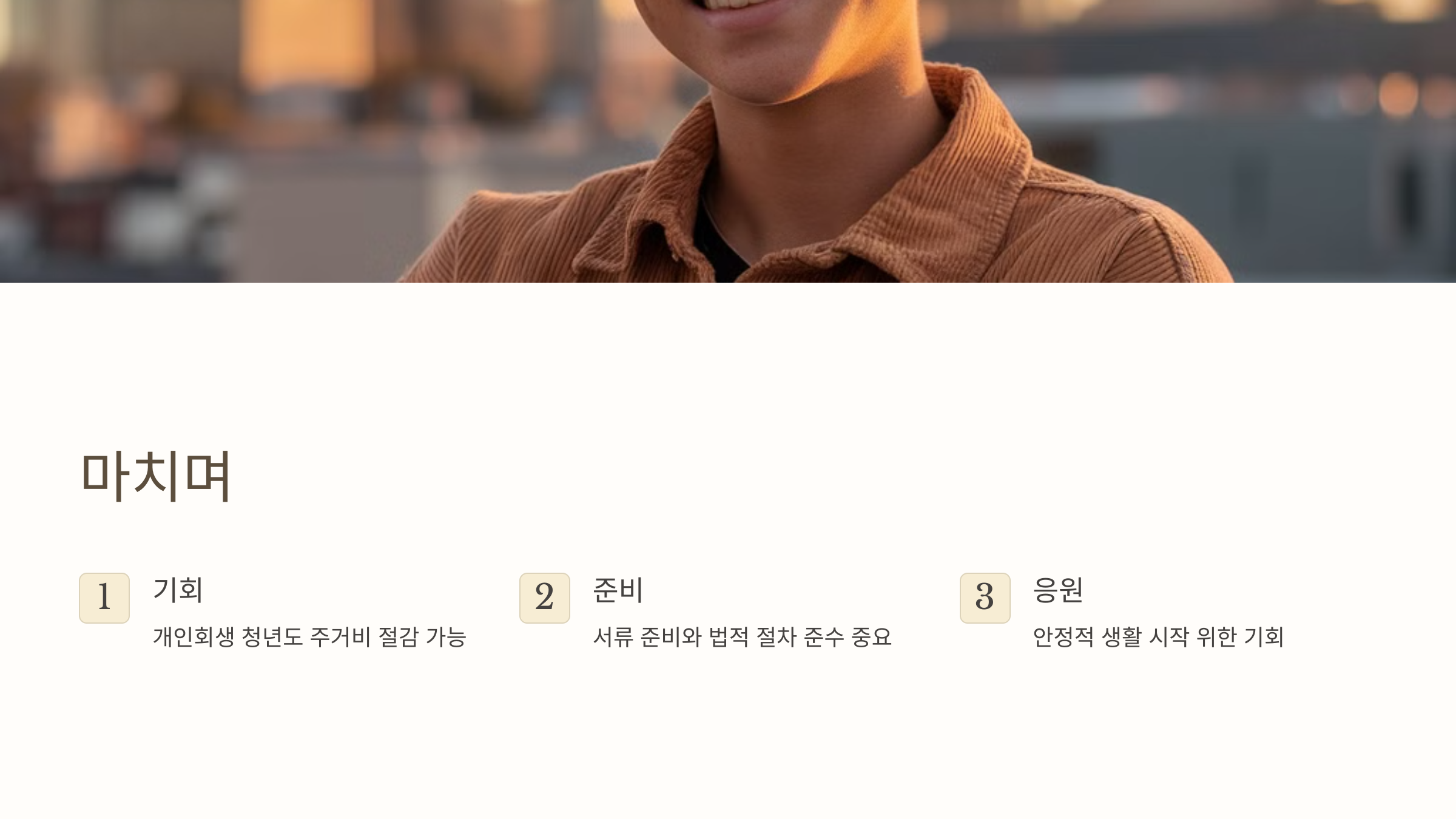 청년월세지원은 개인회생 절차 중인 청년들에게도 주거비를 절감할 수 있는 좋은 기회입니다. 복잡해 보일 수 있지만 필요한 서류를 잘 준비하고 법적 절차를 지키면 큰 어려움 없이 지원받을 수 있어요. 철저한 준비와 전문가 상담을 통해 신청 절차를 마무리하고 안정적인 생활을 시작해보세요. 주거비 부담을 줄이고, 한 단계 더 안정된 삶을 계획할 수 있기를 응원합니다! 😊