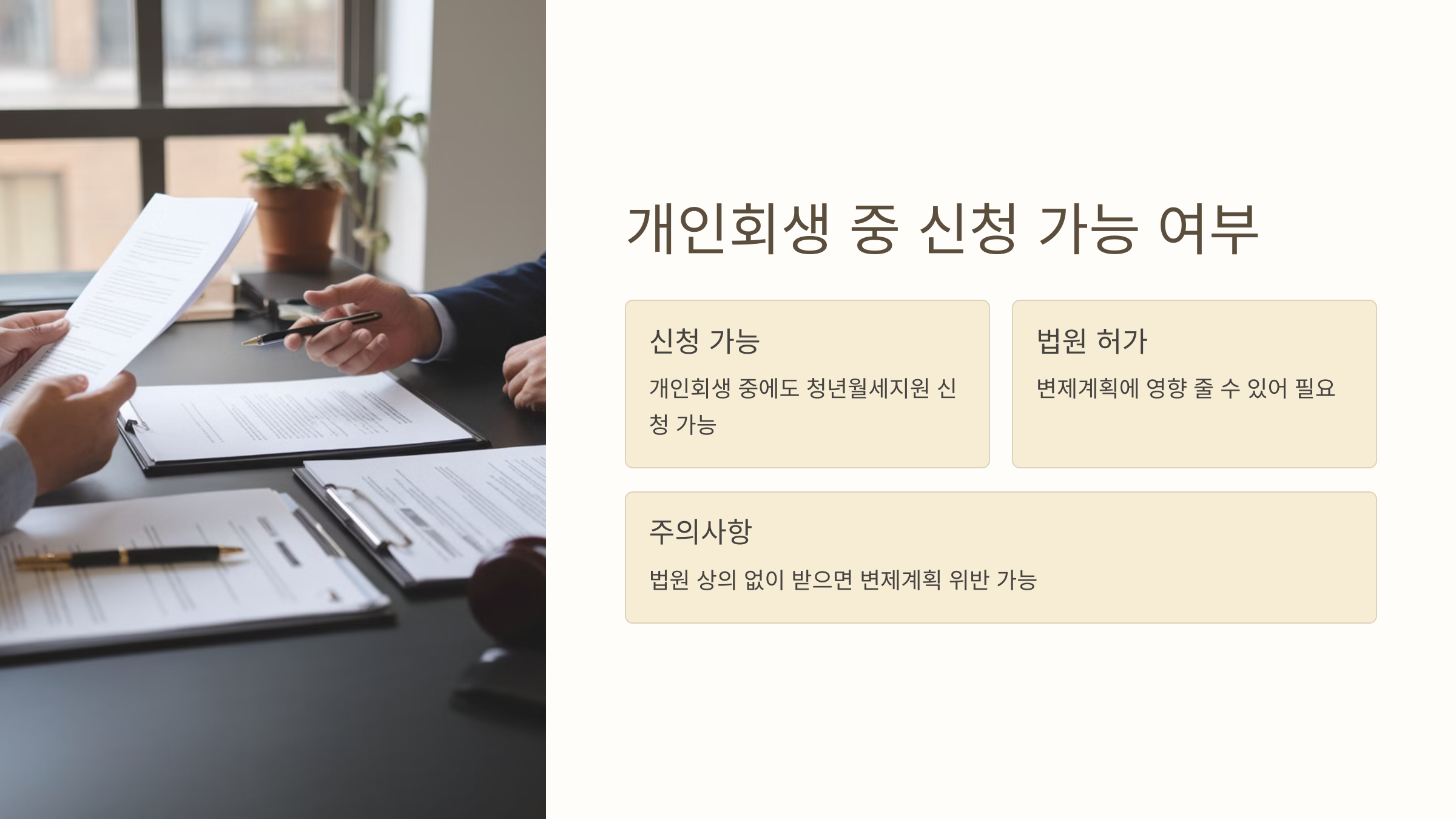 개인회생 절차 중인 청년도 청년월세지원 신청이 가능합니다. 다만, 개인회생 절차에서 월세 지원금을 신청할 경우 변제계획에 영향을 줄 수 있어 법원의 허가가 필요할 수 있습니다.