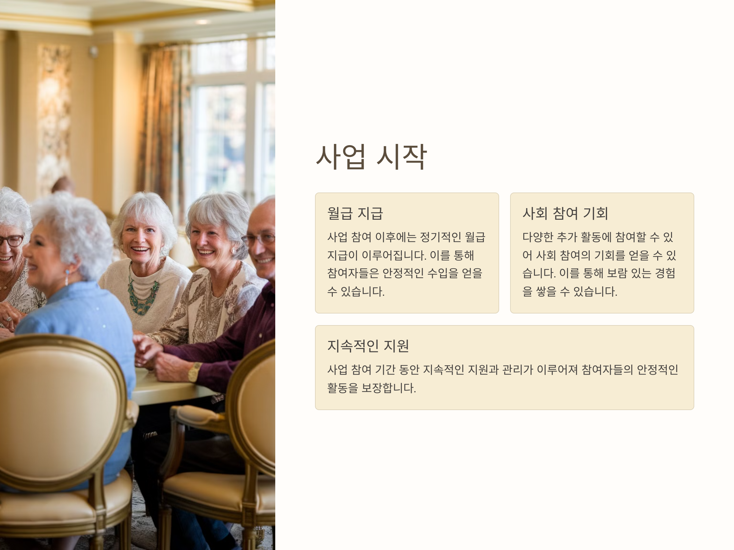 • 긍정적 사회 기여: 어르신들이 생산적인 활동을 통해 사회에 기여하고 있다는 자부심을 느낄 수 있습니다.
