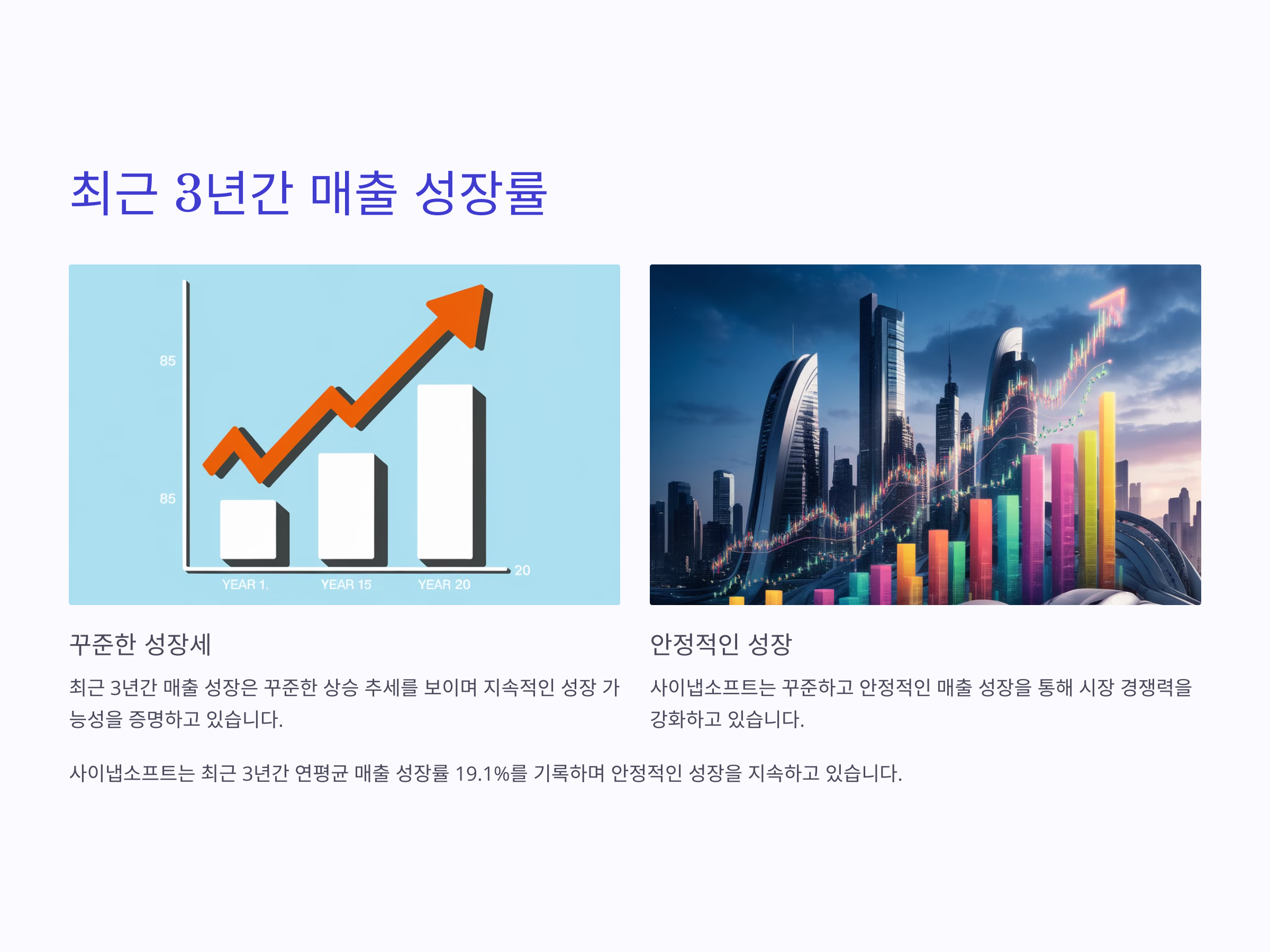 사이냅소프트는 최근 3년간 연평균 매출 성장률 19.1%를 기록하며 안정적인 성장을 지속하고 있어요.
