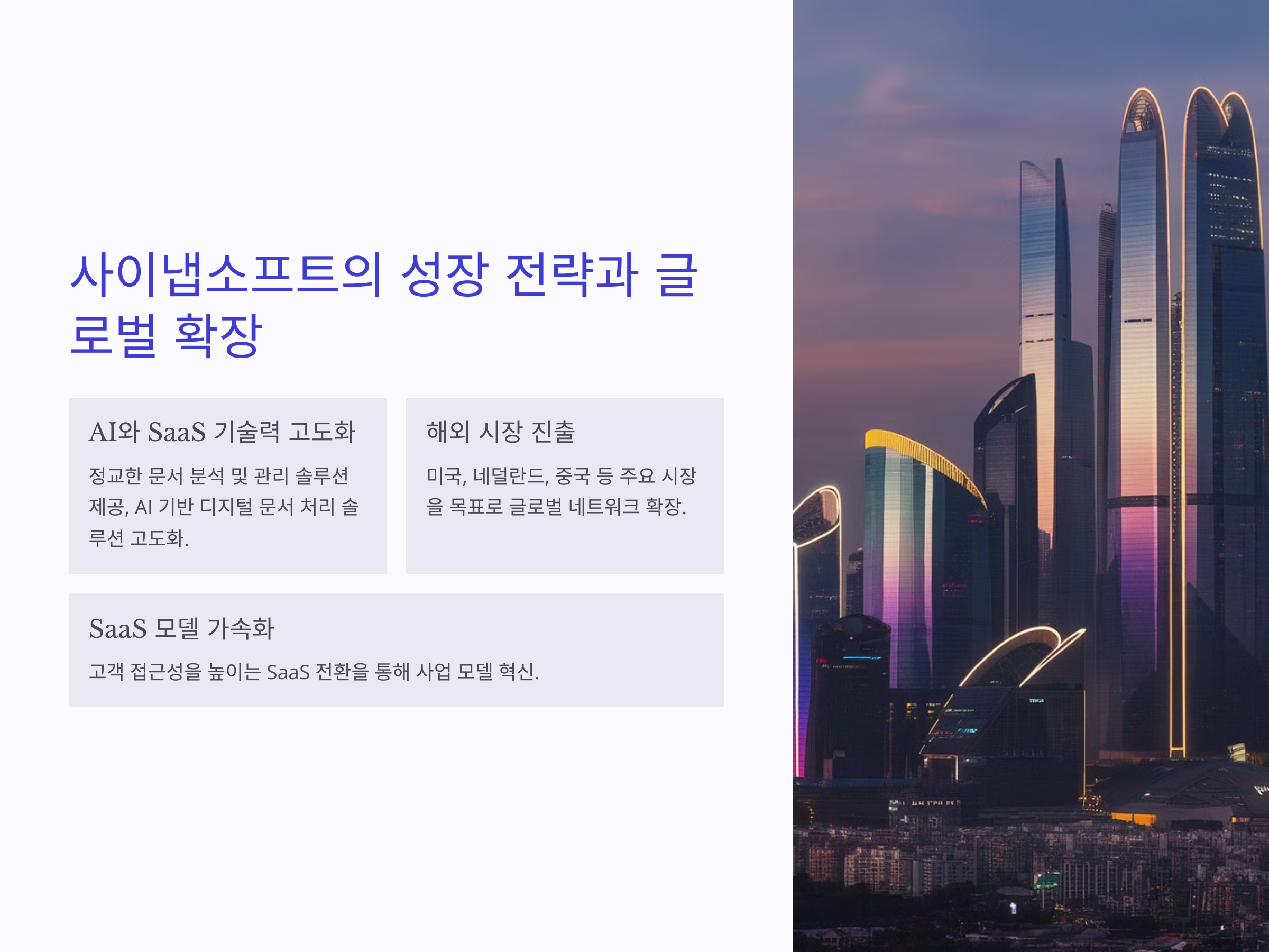 사이냅소프트는 글로벌 시장 확장과 AI 문서 솔루션 고도화, SaaS 모델 전환을 목표로 하고 있습니다.