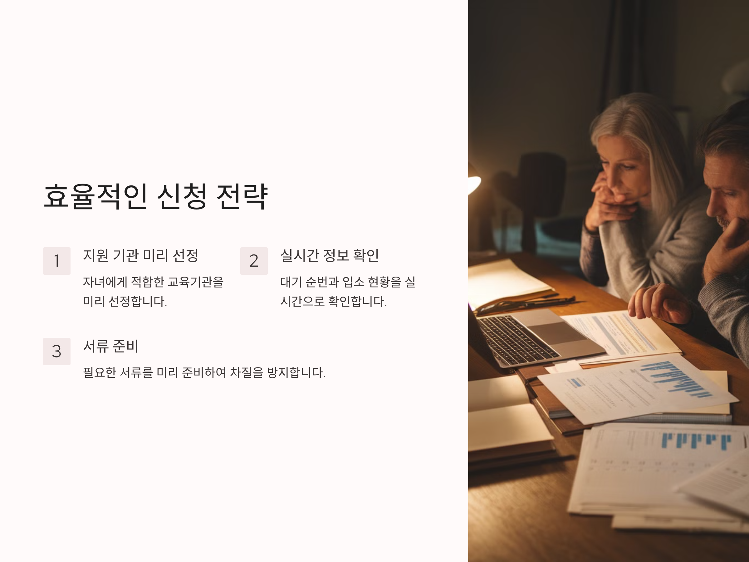 자녀에게 적합한 교육기관을 미리 선정하여, 효율적인 입소 대기 신청 전략을 세우는 것이 중요합니다. 최대 3곳까지 동시 지원할 수 있어 선택의 폭이 넓어집니다.