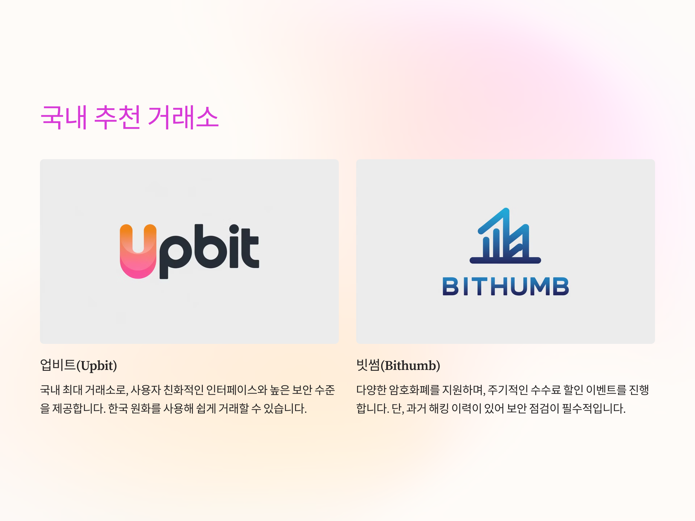 - 국내 최대 거래소로, 사용자 친화적인 인터페이스와 높은 보안 수준을 제공합니다.