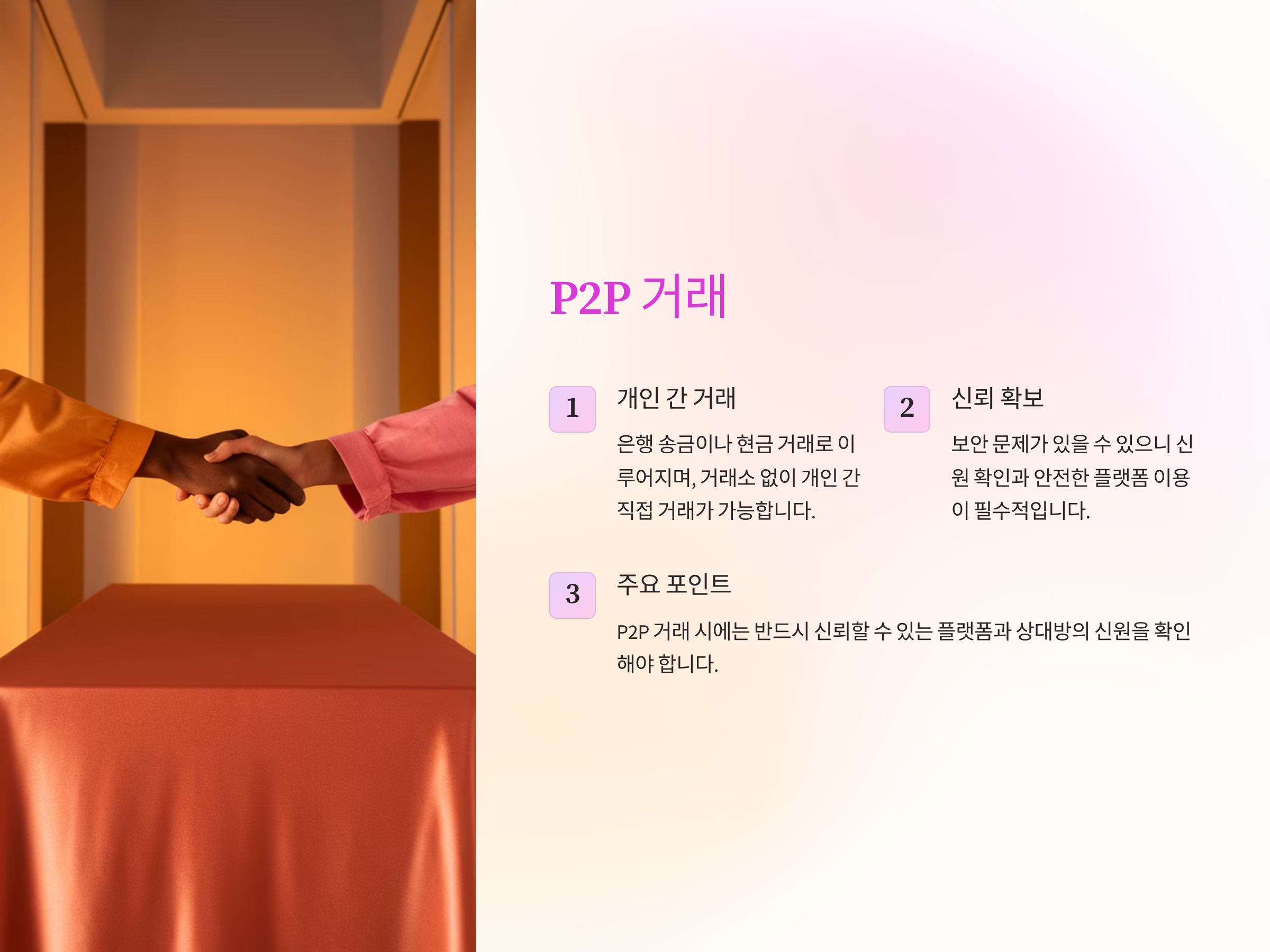 - P2P 개인 간 거래: 거래소 없이 개인이 직접 거래하며, 보안 문제가 발생할 수 있습니다.