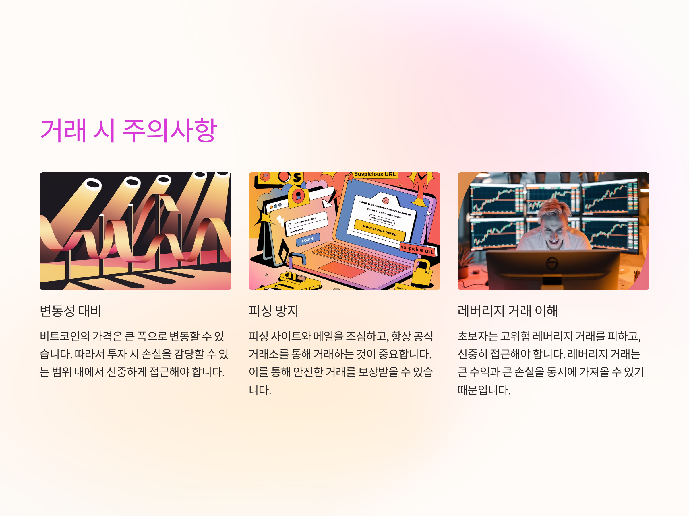 - 피싱 사이트와 메일을 조심하고, 항상 공식 거래소를 통해 거래하세요.